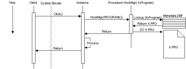 Figure 2: A metadata-based procedural hook illustrated. Here a call to a Hook Manager triggers a lookup which returns the name of a program to execute. Since hooks are used by exception, normally the lookup would return nothing.