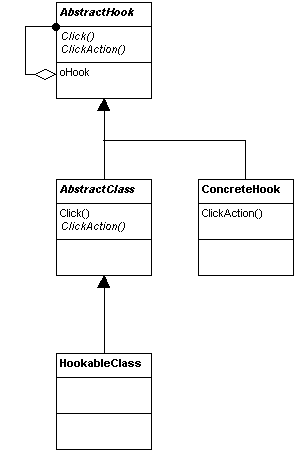 If a hooked object is-a hook, then the concrete objects can use each other as hooks. Effectively, this means they can call each other's services as hook operations. For example, all the controls on a form could use the form's RightClick() services, preserving the RightClick() context of the form whilst the cursor is on a control.
